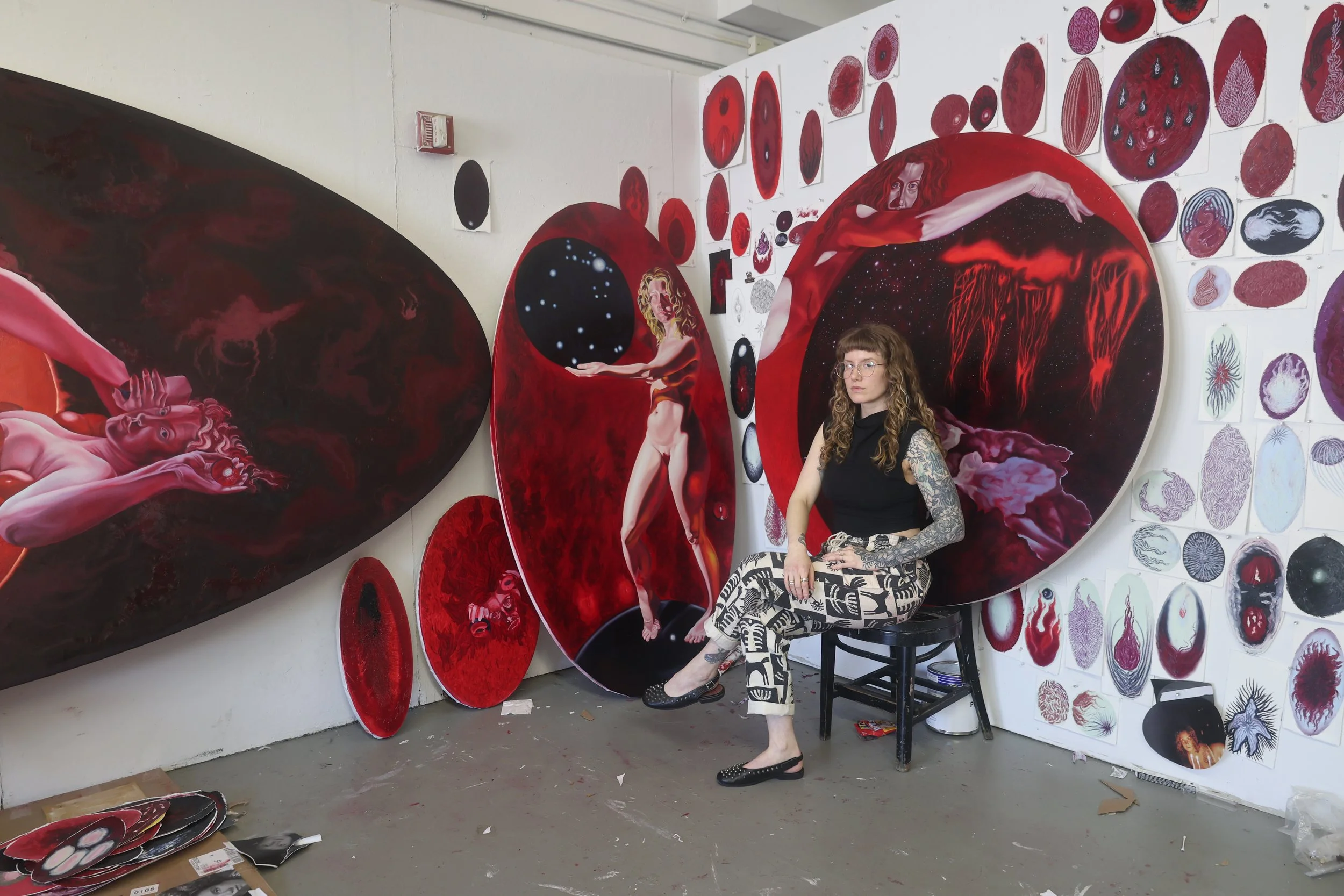 Alexandra Lane Ries (b. 1996; Atlanta, GA) creates painted portals of transition and transformation, harnessing medium and shape to provide a pathway between corporeal and metaphorical realms of being. Raised by a family of female, Jewish artists, Ries furthers a resilient lineage of creatives through her paintings, which explore concepts of place and presence through recurrent visual and literary symbols. Having navigated tragedy, death, and destruction across various chapters of her life, Ries finds a level of comfort in the contemplation of what might exist between our physical presence and another, alternate realm. Aspiring to challenge the physical boundaries of the traditional painting practice, Ries creates canvases using nontraditional supports, building custom arched panels to produce large-scale, multi-panel paintings in the shape of ellipses and circles which serve as alchemical portals of transformation.