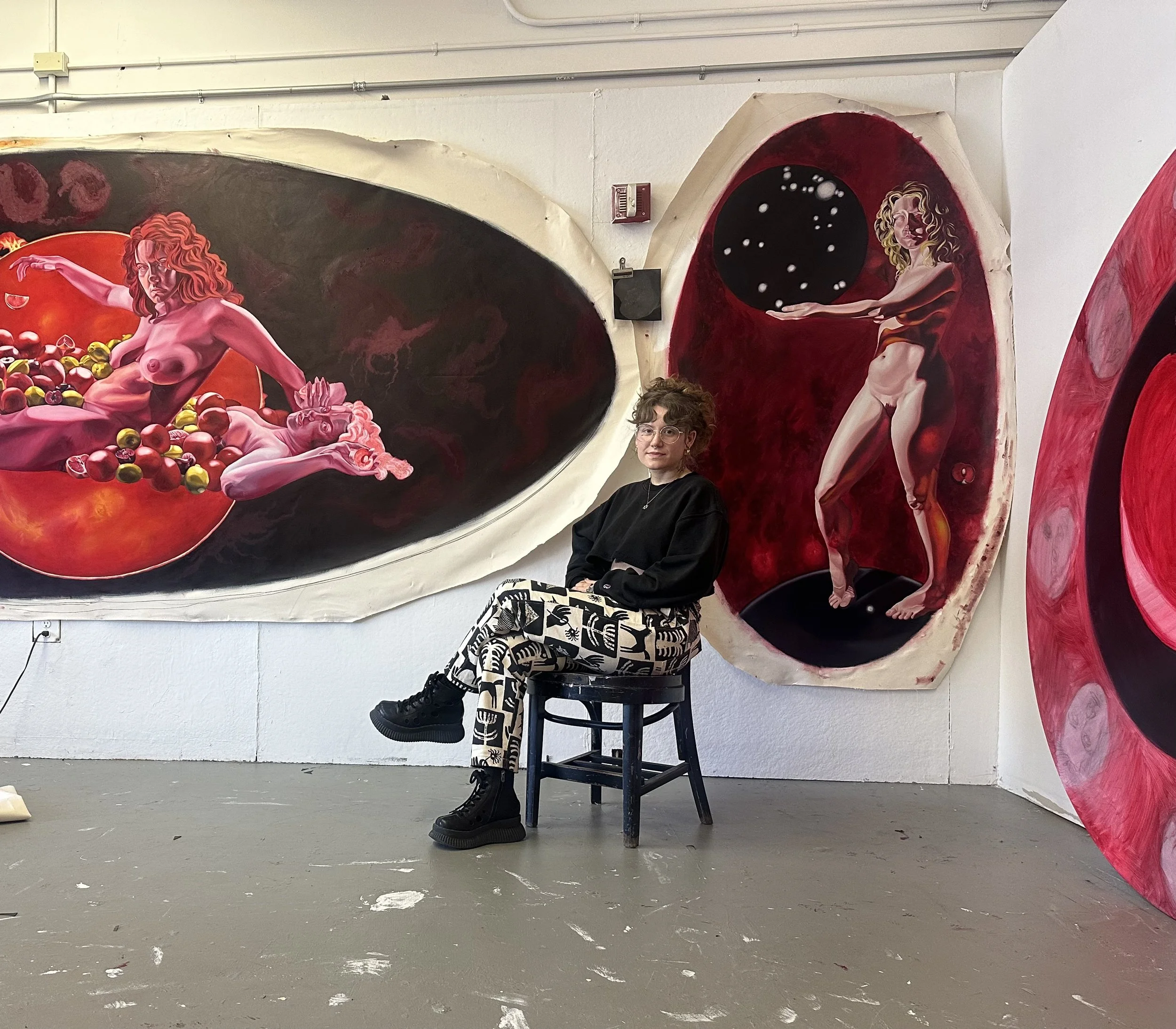 Her work embodies an experience of the Other through the visual and literary motif of the portal, a gateway that appears alongside a variety of characters, objects and places reminiscent of alchemy, French surrealist poetry, and other artists’ writings such as Remedios Varo and Leonora Carrington. Oil paintings on ellipse and circular forms with undulating depths act as doorways to events of transformation and passages. To make these paintings, a cast of characters and objects playing specific roles in relation to a continual motif of citrus/stone fruit. She is investigating modes of communication that convey the potential for extraordinary moments of transcendental activity and experiences in our realm. Alongside this is a collection of her personally written literature, mostly prose, that builds on similar ideas while evoking visceral and ephemeral imagery to build on a specific sense of inhabited presence in surreal otherworldly places. This place of Other evokes a mysterious fluidity; like a shifting labyrinth wherein you cannot be sure if the next thing to present itself will provide you with the key, per se, but you will certainly gain more information from the transpiring of its events.